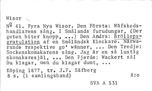 //// Wis or ... //// N= 41. Fyra Nya Wisor. Den Första: Wäfskedshandlarens sång. I Smålands furudungar, (Der geten biter knopp, ...) Den Andra: Bröllops= gratulation af en Småländsk Klockare. Närwa-rande respektive go* wänner, ... Den Tredje: Sockenskomakarens sång. Jag är en så lustig skomakaresjäl, ... Den Fjerde: Wackert så] Du klagar, men du klagar dumt, ... //// Köping 1877, tr. J.F. Säfberg 8 s. (i samlingsband) 8:o //// SVA A 5 31 ////