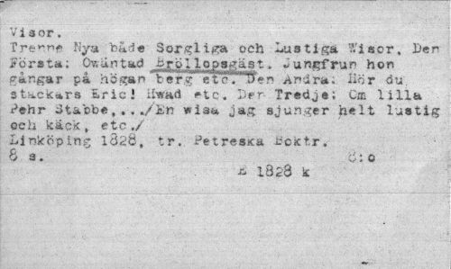 //// Vi aor. //// Treinf Nya både Sorgliga och Lustiga ?.'iscr, Ber Första; Ov.an t ad Jjo 11 o psjgägt. Jungfrun hon fångar på h ö ga n t er g etc!""^ e n Andra. liör du. stackars &ricl ilwad etc, Drr Tredje; C® lilla Pehr Stacbe./En wisa jag sjunger helt lustig och kacs, etc./ //// Linköping 1320, tr. PetresKa JBofctr. Ös. w:o //// ¦t 1828 k ////