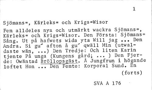 //// 1 //// Sjömans=, Kärleks= och Krigs=Wisor //// Fem alldeles nya och utmärkt wackra Sjömans=, Kärleks= och Krigs=Wisor. Den Första: Sjömans= Sång. Ut på hafwets wida yta Will jag ... Den Andra. Si gu-* afton å gu" qwäll Min (utwal-daste wän, ...) Den Tredje: Och liten Karin tjente På unga (Kungens gård; ... ) Den Fjer-de: Owäntad Bröllopsgäst. Å Jungfrun i högande löftet Hon ... Den Femte: Korporal Sund. En //// (forts) //// SVA A 176 ////