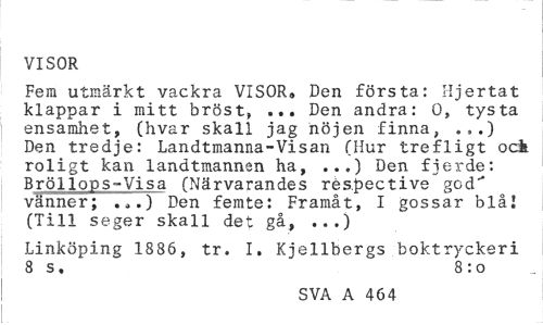 //// VISOR //// Fem utmärkt vackra VISOR» Den första: Hjertat klappar i mitt bröst, ... Den andra: O, tysta ensamhet, (hvar skall jag nöjen finna, .,.) Den tredje: Landtmanna-Visan (Hur trefligt ock roligt kan landtmannen ha, ...) Den fierde: Bröllops-Visa (Närvarandes réspective god" vänner; ...) Den femte: Framåt, I gossar blå! (Till seger skall det gå, ...) //// Linköping 1886, tr. I. Kjellbergs boktryckeri 8 s. 8:0 //// SVA A 464 ////