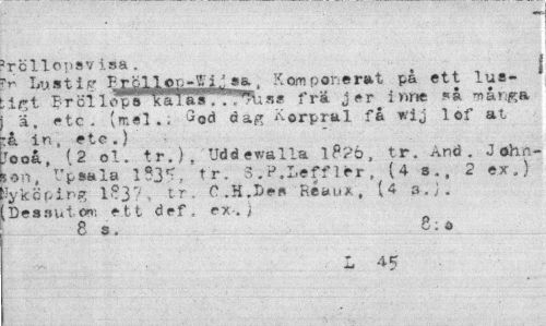 //// <m //// 'rcllopsvIsa. //// ?r Lustig Prolloo-Wi,: sa. Komponerat på ett lua-:<r,t Brölli*sTai"as'! a« frä jer inne «* -nå t.Ra i ä. etc- (mel., ^od dag Korpral få wij lof at tå in„ etc.} //// Jooå, f 2 ol. tr.}, Uddevalla l8?ö, tr. And. J ohn-Upsala tr. 3 .H.Leff l*r, (4 s.„ 2 ex.) //// Syköpin?' 1S-3?. tr. C.H.Les R éaux, (4 3. j. [Dessutom ett def, ex-.) //// 8 s. 8:e //// L 45 ////