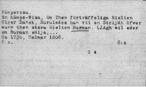 //// Kar pev i sa. //// En Kämpe-Wisa, Om Then förträffeliga Hielten Olfer Dansk, Huruledea han y.ti en Strijdh öfwer »arn then stor» Hielten Burman. tJAgh wil eder om Burman sälja,... - Uo 1730, Calmar 1Ö08. //// ? 9. 8;o //// G 4 //// , -t ////