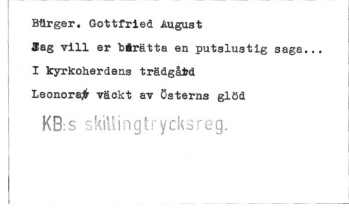 //// Btlrger. Gottfried August //// $ag vill er "bérätta en putslustig saga... //// I kyrkoherdens trädgåid //// Leonorajfr väckt av österns glöd //// KB:S skillingtrycksreg, ////