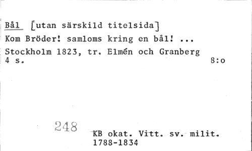 //// Bål [utan särskild titelsida"] //// Kom Bröder! samloms kring en bålI ... //// Stockholm 1823. tr. Elmén och Granberg 4 s. ~ 8:0 //// 248 //// KB okat. Vit:t. sv. milit. 1788-1834 ////