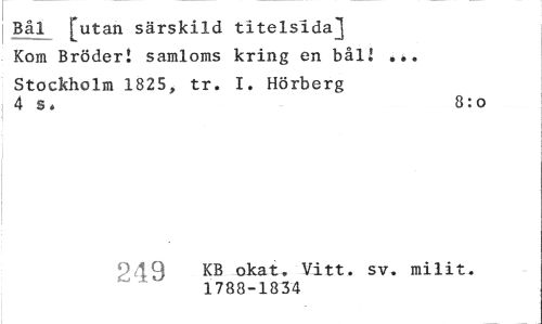 //// Bål [utan särskild titelsida]] //// Kom Bröder! samloms kring en bål! . //// Stockholm 1825, tr. I. Hörberg 4 s» 8:0 //// ; KB okat. Vitt. sv. milit. 1788-1834 ////