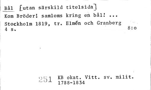 //// i Bål £utan särskild titelsida"] //// Kom Broderi samloms kring en bål.' ... //// Stockholm 1819, tr. Elmén och Granberg 4 s. 8:0 //// ')t, { KB okat. Vitt. sv. milit. ,J± 1788-1834 ////
