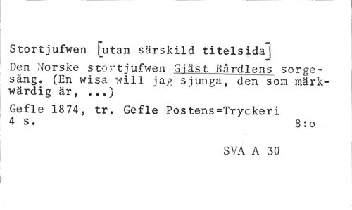 //// Stortjufwen [utan särs kild titelsidaj //// Den Norske stortjufwen Giäst Bårdlens sorgesång. (En wisa will jag sjunga, den som märk-wärdig är, ...) //// Gefle 1874, tr. Gefle Postens=Tryckeri 4 s. 8:0 //// SVA A 30 ////