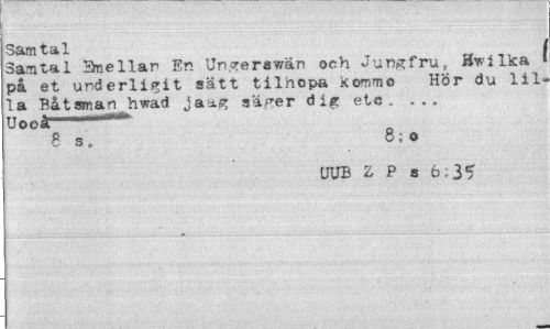 //// Samtal //// Samtal Bnellar En Un.^erswän och Jungfru, Hvilka på et underli^it sätt tilhopa kommo Hor du lil //// la Båtsman hwad jaagj säper di£ etc... //// Uooå- //// 8 s. 8; o //// UUB Z P s 6-35 ////
