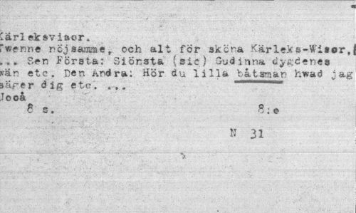 //// ärlekaviaor. //// 'wenne röj samme, och alt för skcra Kärleks-Wisor, ... Sen Första; Siörsta (sic) Gudinna dygdenes fän etc. Den Andra: Hör du lilla båtsmän hwad jag lärer d ig etc. ... looå //// 8 s. 8:e //// N 31 //// ... ^ ... / '" ////