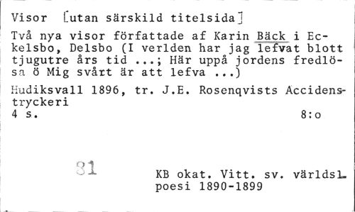 //// Visor Lutan särskild titelsida] //// Två nya visor författade af Karin Bäck i Ec-kelsbo, Delsbo (I verlden har jag lefvat blott tjugutre års tid Här uppå jordens fredlö- //// sa ö Mig svårt är att lefva .,.) //// Hudiksvall 1896, tr. J.E. Rosenqvists Accidens-tryckeri //// 4 s. 8:0 //// Q1 //// oX KB okat. Vitt. sv. världs 1_ //// poesi 1890-1899 ////