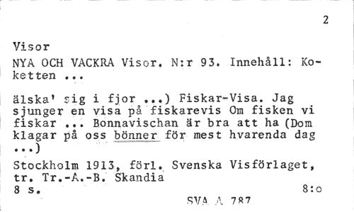//// 2 //// Visor //// NYA OCH VACKRA Visor. N:r 93. Innehåll: Ko-ketten ... //// älska' 5ig i fjor ...) Fiskar-Visa. Jag sjunger en visa på fiskarevis Om fisken vi fiskar ... Bonnavischan är bra att ha (Dom klagar på oss bönner för mest hvarenda dag //// Stockholm 1913, förl. Svenska Visförlaget, tr. Tr.-A.-B. Skandia //// 8 s. 8:o //// SVA A 787 ////