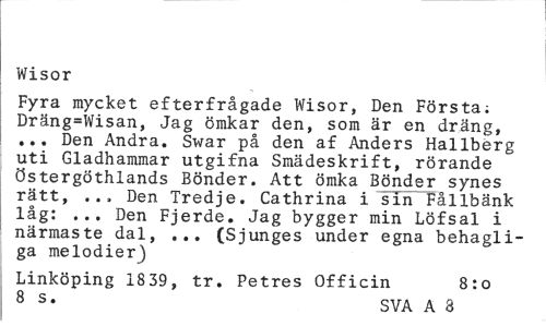 //// Wisor //// Fyra mycket efterfrågade Wisor, Den Första; Dräng=Wisan, Jag ömkar den, som är en dräng, ... Den Andra. Swar på den af Anders Hallberg uti Gladhammar utgifna Smädeskrift, rörande östergöthlands Bönder. Att ömka Bönder synes rätt, ... Den Tredje. Cathrina i sm Fållbänk låg: ... Den Fjerde. Jag bygger min Löfsal i närmaste dal, ... (Sjunges under egna behagliga melodier) //// Linköping 1839, tr. Petres Officin 8:0 //// 8 s* SVA A 8 ////