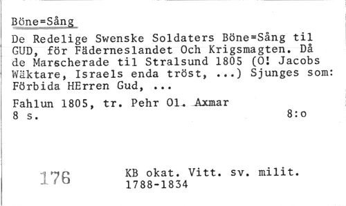 //// De Redelige Swenske Soldaters Böne-Sång til GUD, för Fäderneslandet Och Krigsmagten. Då de Marscherade til Stralsund 1805 (01 Jacobs Wäktare, Israels enda tröst, ...) Sjunges som: Förbida HErren Gud, ... //// Fahlun 1805, tr. Pehr 01. Axraar 8 s. 8: o //// i no KB okat. Vitt. sv. milit. //// J 1788-1834 ////