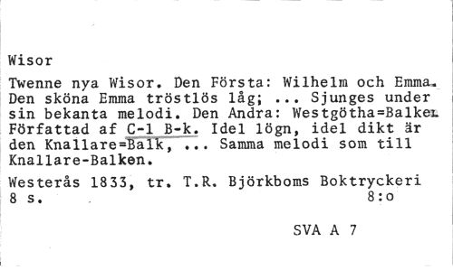 //// Wisor //// Twenne nya Wisor. Den Första: Wilhelm och Emma. Den sköna Emma tröstlös låg; ... Sjunges under sin bekanta melodi. Den Andra: Westgötha=Balkei. Författad af C-l B-k. Idel lögn, idel dikt är den Knallare=Balk, ... Samma melodi som till Knallare-Balken. //// Westerås 1833, tr. T.R. Björkboms Boktryckeri 8 s. 8:0 //// SVA A 7 ////