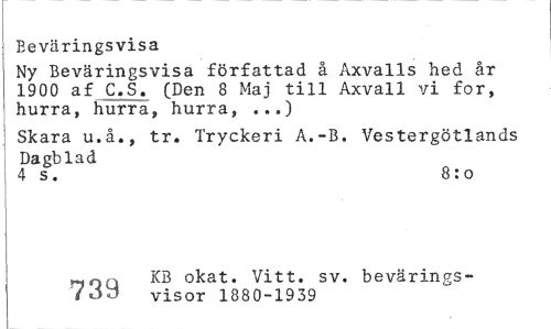 //// Beväringsvisa //// Ny Beväringsvisa författad å Axvalls hed år 1900 af C.S. (Den 8 Maj till Axvall vi for, hurra, hurra, hurra, ...) //// Skara u.å., tr. Tryckeri A.-B. Vestergötlands Dagblad //// 4 s. 8: o //// rinn KB okat. Vitt. sv. bevärines-Y Oö visor 1880-1939 ////