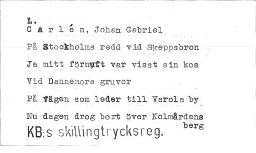 //// 1. //// C ä r 1 e n, Johan Gabriel På Stockholms redd vid Skeppsbron Ja mitt förnuft var visst sin kos Vid Dannemora gruvor På tägen som leder till Varola by Ku dagen drog bort över Kolmårdens //// KB:S skillingtrycksreg. berg ////