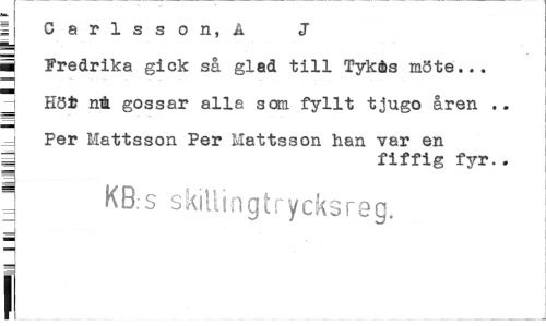 //// 1 Carlsson, A J g //// B Fredrika gick så glad till Tykås möte... //// Höt ni gossar alla som fyllt tjugo aren .. //// = Per Mattsson Per Mattsson han var en ; fiffig fyr.. //// ; KB:s skillingtrycksreg. //// d //// H //// a //// i __ _ .___ ////