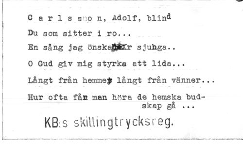 //// Carls sno n, Adolf, blin^ //// Du som sitter i ro... //// En sång jag önska^pfer s jufaga. . //// 0 Gud giv mig styrka att lida... //// Långt från hemme# långt från vänner... //// Hur ofta fån man höra de hemska budskap gå ... //// KB:S skillingtrycksreg. ////