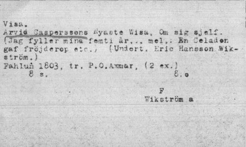 //// Visa. //// Arv^ot ...^MJ^gjr.ssons ^y&ete Kisa-, Om sig sj elf. ("Tag 'fy i 1 er m x na" famti år. .. mel.; Sn C el avi er. gaf fröjder©*- etc../ (Undert. Eric Hansson ils-s trcrn.) //// Fahlun lS03t tr, P.O. Axisar, (2 -x.) //// 8 s. £. o //// F //// Wikström a ////