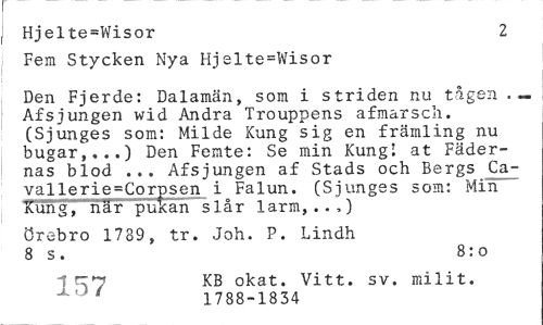 //// Hjelte=Wisor 2 //// Fem Stycken Nya Hjalte=Wisor //// Den Fjerde: Dalamän, som i striden nu tågen Afsjungen wid Andra Trouppens afmarsch. (Sjunges som: Milde Kung sig en främling nu bugar,...) Den Femte: Se min Kung; at Fädernas blod ... Afsjungen af Stads och Bergs Ca-vallerie=Corpsen i Falun. (Sjunges som: Min Kung, när pukan slår larm,..,) //// Örebro 1789, tr. Joh. P. Lindh 8 s. 8: o //// 1 rzn KB okat. Vitt. sv. milit. //// " ' 1 1788-1834 ////