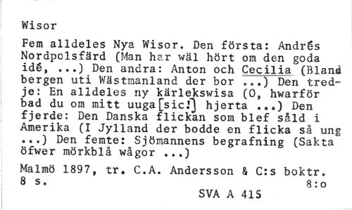 //// Wisor //// Fem alldeles Nya Wisor. Den första: Andrés Nordpolsfärd (Man har wäl hört om den goda idé, ...) Den andra: Anton och Cecilia (Bland bergen uti Wästmanland der bor ...) Den tredje: En alldeles ny kärlekswisa (0, hwarför bad du om mitt uuga[sicf) hjerta ...) Den fjerde: Den Danska flickan som blef såld i Amerika (I Jylland der bodde en flicka så ung ...) Den femte: Sjömannens begrafning (Sakta öfwer mörkblå wågor ...) //// Malmö 1897, tr. C.A. Andersson & C:s boktr. 8 s. 8 :o //// SVA A 415 ////