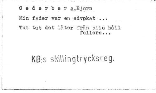 //// Cederber g,Björn //// Min feder var en advpkat ... //// Tut tut det låter från alla håll //// fallera... //// ! KB:S skillingtrycksreg. //// I ////