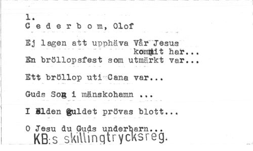//// 1. //// Cederbom, Olof //// Ej lagen att upphäva Vår Jesus //// korallt har... En bröllopsfest som utmärkt var... //// Ett bröllop uti Cana var... //// Guds Sog i mänskohamn ... //// I Siden guldet prövas blott... //// 0 Jesu du Guds underbarn... //// KB.s skillingtrycksreg. ////