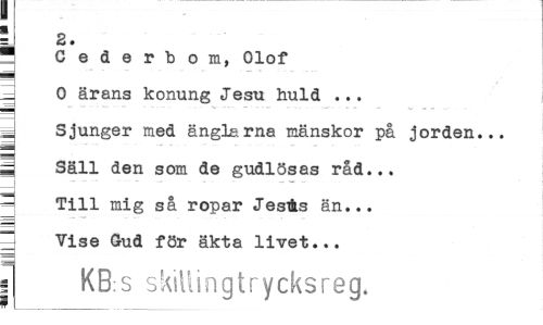 //// I //// L 2. //// 5 Cederbom, Olof //// = 0 ärans konung Jesu huld ... //// _ Sjunger med änglarna mänskor på jorden... //// 3 Säll den som de gudlösas råd... //// - Till mig så ropar Jesiiis än... //// | Vise Gud för äkta livet... //// i KB:s skillingtrycksreg. //// ?___ ////