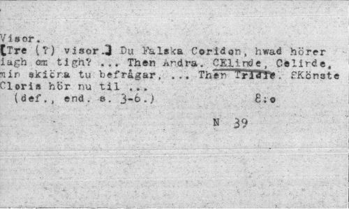//// /isor. //// £Tre (?) visor.3 Du Falska Coridon, hwad hörer Lagh om tighV ... Then Andra. CEllnoc, Celirde. lin skicr.a tu befrågar, ... Then ""T rid T»'. EKönate "loris hör nu til ... (def., end. ». •) //// N 39 ////