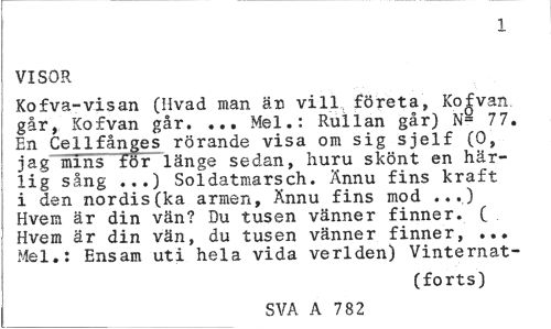 //// 1 //// VISOR //// Kofva-visan (Hvad man än vill, företa, Kofvan går, Kofvan går. ... Mel.: Rullan går) N= 7 7. En Cellfånges rörande visa om sig sjelf (0, jag mins för länge sedan, huru skönt en härlig sång ...) Soldatmarsch. Ännu fins kraft i den nordis(ka armen, Ännu fins mod ...) Hvem är din vän? Du tusen vänner finner. ( Hvem är din vän, du tusen vänner finner, ... Mel.: Ensam uti hela vida verlden) Vinternat- //// (forts) //// SVA A 1 70 ////
