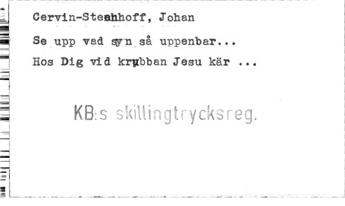 //// y Cervin-Steefahoff, Johan //// ml Se upp vad ^rn så uppenbar... //// Hos Dig vid krabban Jesu kär ... //// ] //// 3 K8:s skillingtrycksreg. //// q J ////