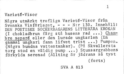 //// 1 //// VarietS-Visor //// Några utmärkt trefliga Varieté-Visor från Svenska Vis förlaget, - - - N;r 130. Innehåll: DEN POETISKE SOCKERBAGARENS LITTERÄRA KROKAN (I chokladbrun färg stå husens rad *..) Cham-bre separé eller den lurade ungkarlen (En gammal ungkarl fann lifvet trist ...) Pumpen. (Några bundna vattentankar). (På Skvallersta torg stod en väldig pump,...) Stunsargrabbens förkylda serenad (Allting är jädrans så tyst //// (forts) //// SVA A 1 70 ////