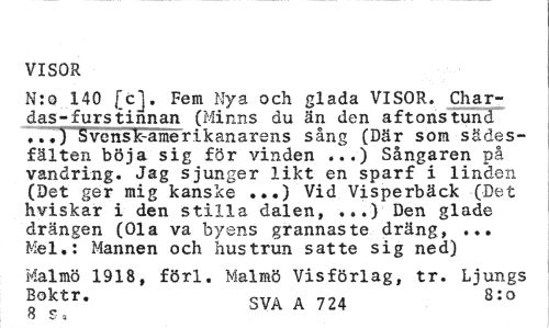 //// VISOR //// N:o 140 [c]. Fem Nya och glada VISOR. Char-das-furstinnan (Minns du än den aftonstund 7..} Svensk-amerikanarens sång (Där som sädesfälten böja sig för vinden ...) Sångaren på vandring. Jag sjunger likt en sparf i linden (Det ger mig kanske ...) Vid Visperbäck (Det hviskar i den stilla dalen, ...) Den glade drängen (Ola va byens grannaste dräng, ... Mel.: Mannen och hustrun satte sig ned) //// Malmö 1918, förl. Malmö Vis förlag, tr. Ljungs Eoktr. SVA A ?24 8:o ////