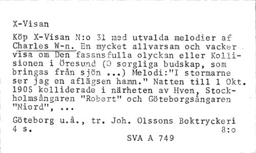 //// X-Visan //// Köp X-Visan N:o 31 med utvalda melodier af Charles W-n. En mycket allvarsam och vacker visa om Den fasansfulla olyckan eller Kollisionen i Öresund (0 sorgliga budskap, som bringas från sjön ...) Melodi:"I stormarne ser jag en aflägsen hamn." Natten till 1 Okt. 1905 kolliderade i närheten av Hven, Stockholmsångaren "Robert" och Göteborgsångaren "Niord", ... //// Göteborg u.å., tr. Joh. Olssons Boktryckeri 4 s. 3: o //// SVA A 749 ////