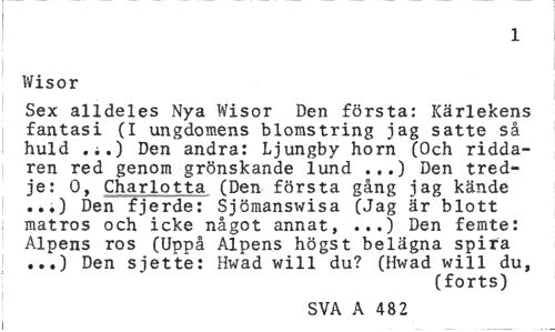//// 1 //// Wisor //// Sex alldeles Nya Wisor Den första: Kärlekens fantasi (I ungdomens blomstring jag satte så huld .;.) Den andra: Ljungby horn (Och riddaren red genom grönskande lund ...) Den tred*-je: 0, Charlotta (Den första gång jag kände . .?) Den fjerde: Sjömanswisa (Jag är blott matros och icke något annat, ...) Den femte: Alpens ros (Uppå Alpens högst belägna spira ...) Den sjetté: Hwad will du? (Hwad will du, //// (forts) //// SVA A 482 ////