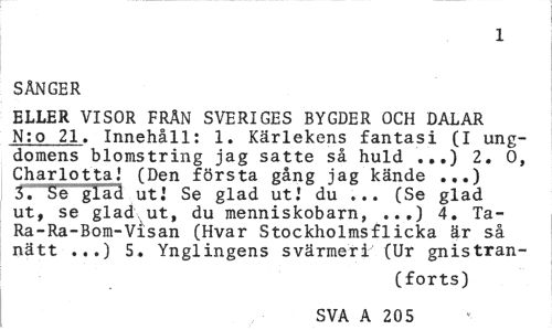//// 1 //// SÅNGER //// ELLER VISOR FRÄN SVERIGES BYGDER OCH DALAR N:o 21. Innehåll: 1. Kärlekens fantasi (I ungdomens blomstring jag satte så huld ...) 2. O, Charlotta! (Den första gång jag kände ...) 3. Se glad ut.1 Se glad uti du ... (Se glad ut, se glad ut, du menniskobarn, ...) 4. Ta-Ra-Ra-Bom-Visan (Hvar Stockholmsflicka är så nätt 5. Ynglingens svärmeri (Ur gnistran- //// (forts) SVA A 205 ////