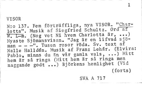 //// X //// VISOR //// N:o 137. Fem förträffliga, nya VISOR. "Charlotta". Musik af Siegfried Schultz. Ord af W. L-m. (Nog vet Ni hvem Charlotta är, ...) Nyaste Sjömansvisan. "Jag är en lifvad sjöman ---". Tusen rosor röda. Sv. text af //// Nalle Halidén. Musik af Franz Lehår. (Elvira: Pablo, minns du än vår gamla vals, ...) Mitt hem är så ringa (Mitt hem är så ringa men naggande godt ...) Björkens hemlighet (Vid //// (forts) //// SVA A 717 ////