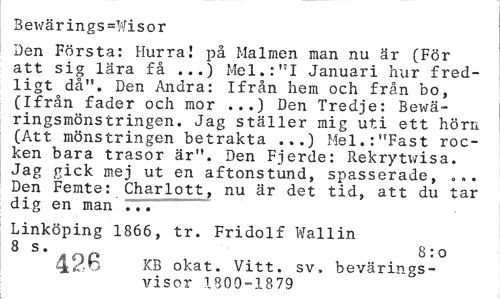 //// 3 ewär in gs =Wi s o r //// Den Första: Hurra! på Malmen man nu är (För att sig lära få ...) Mel.:"I Januari hur fredligt då". Den Andra: Ifrån hem och från bo, (Ifrån fader och mor ...) Den Tredje: Bewä-ringsmönstringen. Jag ställer mig uti ett hörn (Att mönstringen betrakta ...) Mel.:"Fast rocken bara trasor är". Den Fjerde: Rekrytwisa. Jag gick mej ut en aftonstund, spasserade, ... Den Femte: Charlott, nu är det tid, att du tar dig en man ... //// Linköping 1866, tr. Fridolf Wallin 8 s. 8:0 //// KB okat. Vitt. sv. bevärings-visor 1800-1879 ////