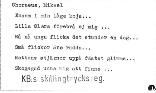 //// Choraeus, Mikael Ensam i min låga koja... Lilla Cl era förebrå ej mig ... Nå nå unga flicka det stundar en dag... Små flickor äro rädda... Nattens stjärnor uppå fästet glimma... Skogsgud unna mig att finna ... //// KB:S skillingtrycksreg. //// ___ i) ////