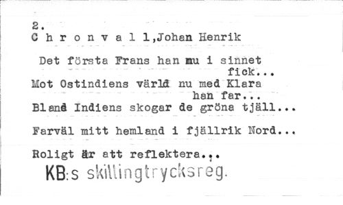 //// 2. //// Chronval 1,Johan Henrik //// Det första Frans han nu i sinnet //// fick... //// Mot Ostindiens värld nu med Klara //// han far... Bland Indiens skogar de gröna tjäll... //// Farväl mitt hemland i fjällrik Nord... //// Roligt är att reflektera.,. //// KB:S skillingtrycksreg. ////