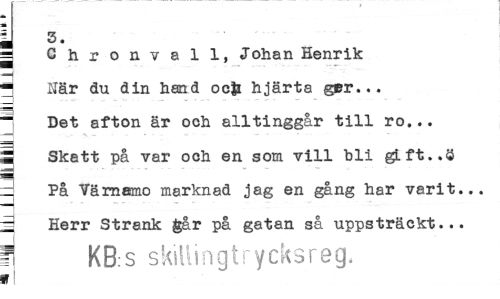 //// y //// Chronvall, Johan Henrik //// ^ Här du din hand ocji hjärta ger... //// j Det afton är och alltinggår till ro... //// S Skatt på var och en som vill bli glft..ö //// d På Värnamo marknad jag en gång har varit... //// i Herr Strank &år på gatan så uppsträckt... //// i KB:S skillingtrycksreg. //// i ////