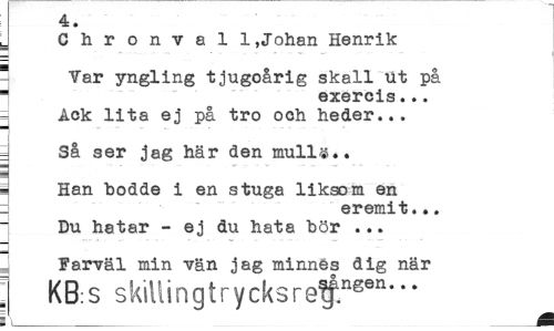 //// 4. //// J Chronvall,Johan Henrik //// Tar yngling tjugoårig skall ut på s exercis... //// Ack lita ej på tro och heder... //// f Så ser jag här den mull®.. //// i Han bodde i en stuga liksom en //// eremit... Du hatar - ej du hata bör ... //// Farväl min vän jag minnes dig när //// | KB s skillingtrycksreg611"* ////