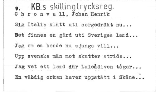//// 9. KB:S skillingtrycksreg. //// Chronvall, Johan Henrik Sig Italia klätt uti sorgedräkt nu... Det finnes en gård uti Sveriges land... Jag om en bonde nu sjunga vill... Upp svenska män mot skstter strida... Jag vet ett land där Luleåälven tågar... En väfcdig orkan haver uppstått i Skåne... ////