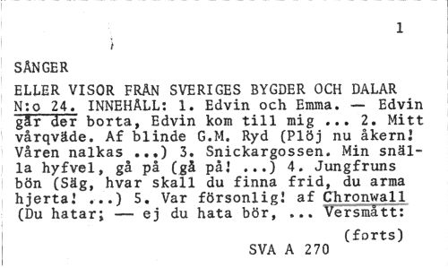 //// 1 //// ) //// SÅNGER //// ELLER VISOR FRÅN SVERIGES BYGDER OCH DALAR N:o 24. INNEHÅLL: 1. Edvin och Emma. - Edvin går der borta, Edvin kom till mig ... 2. Mitt vårqväde. Af blinde G.M. Ryd (Plöj nu åkern! Våren nalkas ...) 3. Snickargossen. Min snälla hyfvel, gå på (gå på,1 ...) 4. Jungfruns bön (Säg, hvar skall du finna frid, du arma hjerta! ...) 5. Var försonlig.' af Chronwall (Du hatar; - ej du hata bör, ... Versmått: //// (forts) //// SVA A 2 70 ////
