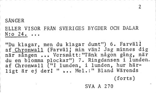 //// 2 //// SÅNGER //// ELLER VISOR FRÄN SVERIGES BYGDER OCH DALAR N:o 24. ... //// "Du klagar, men du klagar dumt") 6. Farväl! af Chronwall (Farväl} min vän.' Jag minnes dig när sången ... Versmått:"Tänk någon gång, när du en blomma plockar") 7. Ringdansen i lunden, af Chronwall ("I lunden, i lunden, hur härligt är ej der! " ... Mel.:" Bland Wärends //// (forts) //// SVA A 2 70 ////