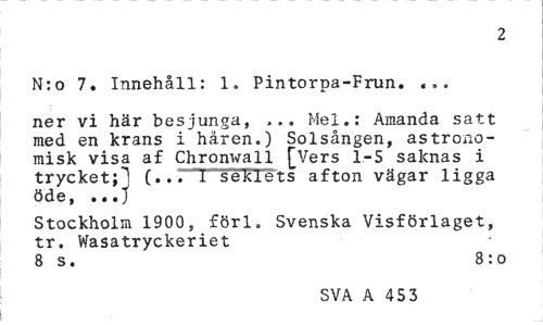 //// 2 //// N:o 7. Innehåll: 1. Pintorpa-Frun. //// ner vi här besjunga, ... Mel.: Amanda satt med en krans i håren.) Solsången, astronomisk visa af Chronwall [Vers 1-5 saknas i trycket;! (... "I seklets afton vägar ligga öde, //// Stockholm 1900, förl. Svenska Visförlaget, tr. Wasatryckeriet //// 8 s. 8:o //// SVA A 22 3 ////