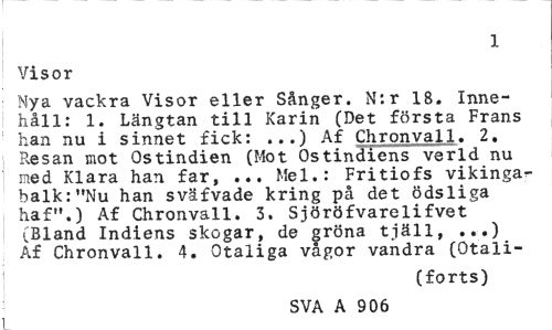 //// 1 //// Visor //// Nya vackra Visor eller Sånger. N:r 18. Innehåll: 1. Längtan till Karin (Det första Frans han nu i sinnet fick: ...) Af Chronvall. 2. Resan mot Ostindien (Mot Ostindiens verld nu ned Klara han far, ... Mel.: Fritiofs vikingabalk: "Nu han sväfvade kring på det ödsliga haf".) Af Chronvall. 3. Sjöröfvarelifvet (Bland Indiens skogar, de gröna tjäll, ...) Af Chronvall. 4. Otaliga vågor vandra (Otali- //// (forts) //// SVA A 906 //// i ////