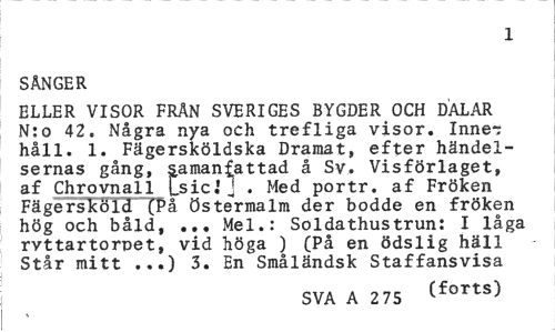 //// 1 //// SÅNGER //// ELLER VISOR FRÄN SVERIGES BYGDER OCH DALAR N:o 42. Några nya och trefliga visor. Inne-; håll. 1. Fägersköldska Dramat, efter händelsernas gång, samanfattad å Sv. Visförlaget, af Chrovnall Lsic.1] . Med portr. af Fröken Fägersköld (På Östermalm der bodde en fröken hög och båld, ... Mel.: Soldathustrun: I låga rvttartorpet, vid höga ) (På en ödslig häll Står mitt ...) 3. En Småländsk Staffansvisa //// SVA A 2 75 Cforts) ////