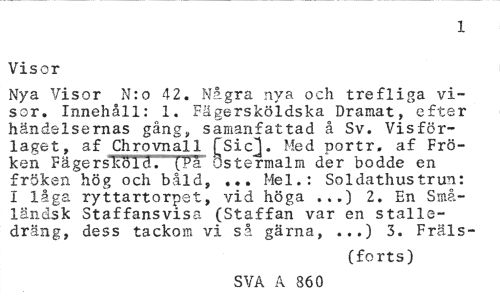 //// 2 //// Visor //// Nya Visor N:o 42. Några nya och trefliga visor. Innehåll: 1. Fägersköldska Dramat, efter händelsernas gång, samanfattad å Sv. Visförlaget, af Chrovnall £Sic^. Med portr. af Fröken Fägersköld. (.På Östermalm der bodde en fröken hög och båld, ... Mel.: Soldathustrun: I låga ryttartorpet, vid höga ...) 2. En Småländsk Staffansvisa (Staffan var en stallsdräng, dess tackom vi så gärna, ...) 3. Fräls- //// (forts) //// SVA A 22 3 ////