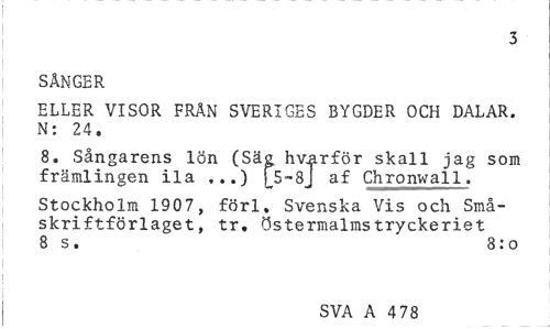 //// 2 //// SÅNGER //// ELLER VISOR FRÄN SVERIGES BYGDER OCH DALAR. N: 24. //// 8. Sångarens lön (Säg. hvarför skall jag som främlingen ila ...) [5-8J af Chronwall, //// Stockholm 190 7, förl. Svenska Vis och Småskriftförlaget, tr. östermalmstryckeriet 8 s. 8:o //// SVA A 22 3 ////